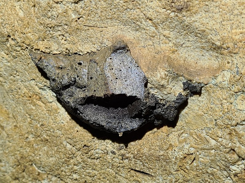 Immediately after the first crawling section of the passage, this fossil, which appears to be a Psammodus tooth plate, can be seen on the wall.