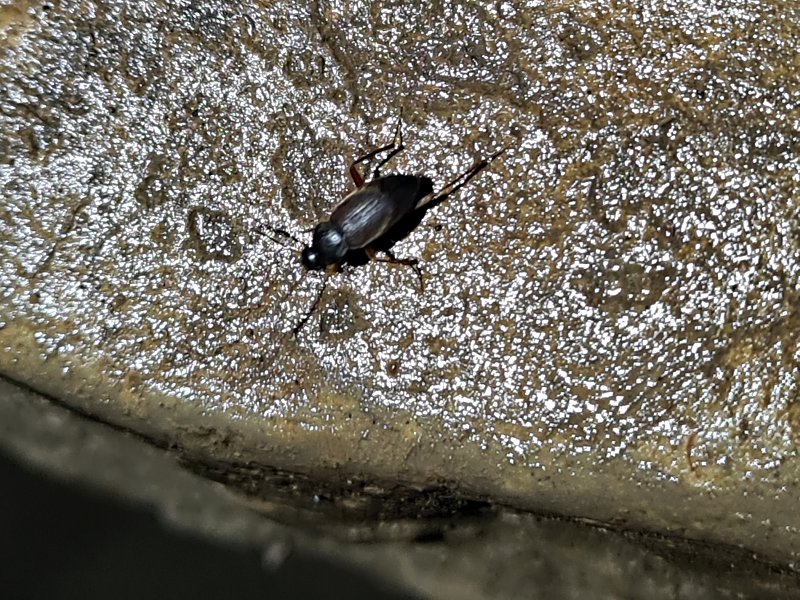 A ground beetle on the cairn at Cairn Junction, which has a distinctive thorax shoulder, and reflective upturn at the edge of the wing casing. At only 7 mm long, it is too small to be a Carabeus, and is a much closer match for a young Calathus cf. rotundicollis, which is found in that area, and has the correct head shape. It could also be an adult Calathus micropterus, but that has brighter legs. It did not want to stay still for long enough to take a clearer picture.