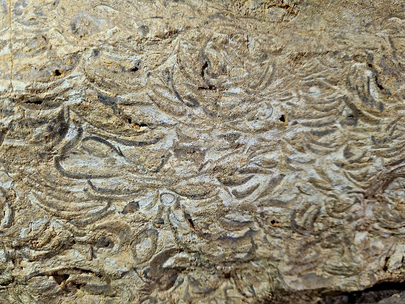 The most highly textured fossil in Raiders Passage, which I had already photographed, but have not yet been able to identify. It is almost certainly a proto-shark, like Ctenacanthus, Psammodus or Gyracanthus, but I do not know exactly which proto-shark or which bone it is.