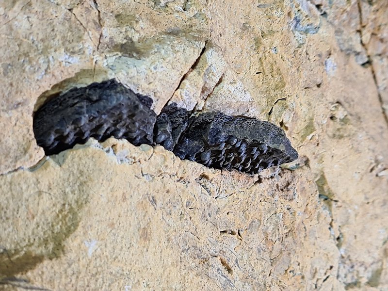 Another ring-shaped fossil, now beyond the fault in Raiders Passage. This one has very visible longitudinal ridges, showing that it should be a Ctenacanthus dorsal spine.