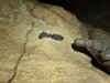 Historic sign at the start of the passage, which temporarily denied access between 1995 and 1996 while a bat study was carried out. While the passage contains massive guano piles, they are all historical, and the passage is hardly used by bats now, compared with other parts of the cave. Access to the passage is allowed, even if the signs might seem to say otherwise. The normal way on is to traverse over the cleft until a way can be found to climb down it. However, there is a very significant side passage beyond the historical tape as well.