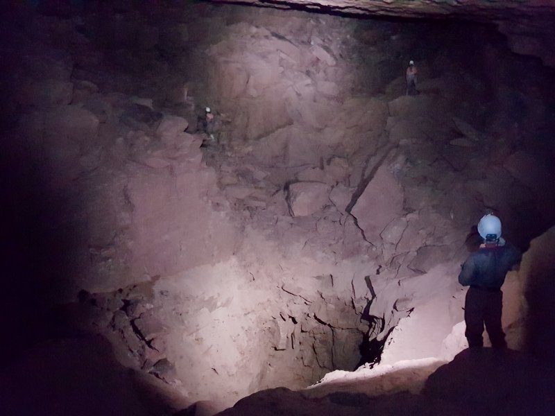 The bedding ends at Starlight Chamber, one of the two largest chambers in the cave. The enormous pit in the floor sits directly above the Boulder Chamber choke, but over 40 metres above it. The lighting for this picture is done with two modern caving lamps, with their regular club lamps not even registering a silhouette - the picture would have looked better with good lighting. There is no way on from here, so we returned through the bedding crawls.
