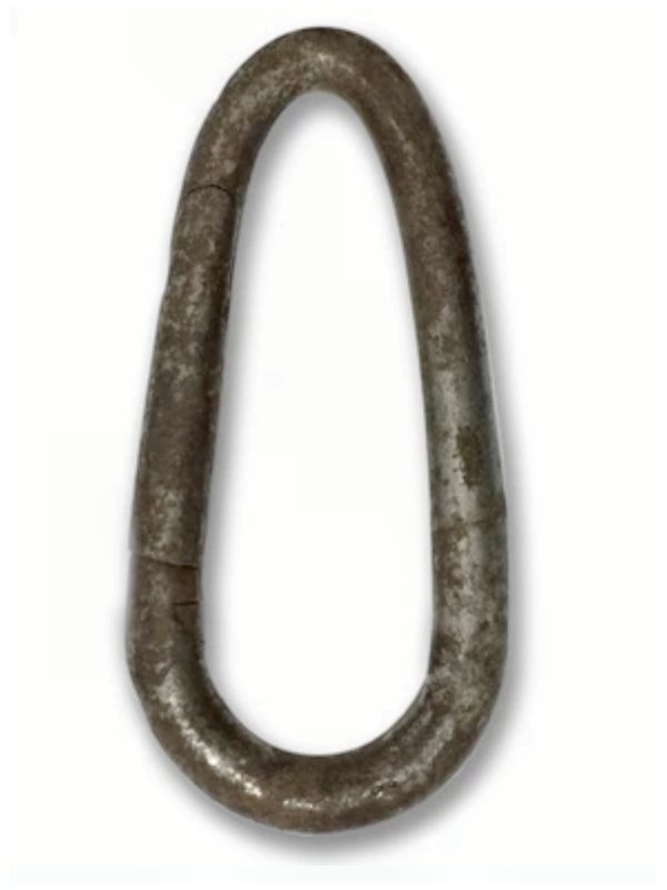 Pinned mortice and tenon joints (how carabiner gates are connected) first appeared in wood, with the earliest known example dating from 5099 BCE in what is now Germany, used for lining a well. Bronze bangles (bracelets) were made in Brittany, France in 1450-1300 BCE, which have a hinged gate with a mortice and tenon latch, held closed with a pin. They did not spring closed, and the shape would allow loads to rest on the relatively weak gate, but they are otherwise impressively similar to a modern carabiner. Other designs relied only on pinned mortice and tenon latches. They were presumably created by the Armorican Tumulus people. This incredible find was reported in "Nordez, M. (2023). Metal hoards in a ritual space? The Atlantic Middle Bronze Age site of Kerouarn, Prat (Côtes-d'Armor, France)". This approach had spread to Austria, Switzerland and Britain by 400-200 BCE. Fibulae brooches that worked almost identically to a safety pin, had appeared as early as 1400 BCE in Mycenaean Greece, and designs are still used today. Unlike a carabiner, the spring tries to open the gate, and it needs to be manually closed. Greek earrings from 400-200 BCE and better versions from 200-1 BCE used the same approach. Roman padlocks had large locks that had to be manually assembled to close them, rather than the hinge and spring of a carabiner gate. Rings almost identical to the non-hinged Brittany bangles, which may have been slave shackles, were also identified as Roman, but their origin and age is unknown. Neither half of the ring could be used without the other, unlike a carabiner's hook and separate gate. Lombard earrings from around 750 CE used the same principle as the safety pin, in Cividale del Friuli in northern Italy. Oval links that look almost exactly like an oval carabiner, were in use by the Landshut Armoury in 1485, in Bavaria-Landshut, Holy Roman Empire, now Germany, depicted in the Zeughausinventar von Landshut by armory master builder Ulrich Pesnitzer. These had a removable mortice and tenon gate, presumably using pins at each end instead of a hinge and latch, and could function as a hook without the gate. These were used as a removable link which could be connected to a rope, just like a modern carabiner. They almost certainly did not have a sprung gate, so they would not normally be considered to be a carabiner, and were called "hagken", an older spelling meaning "hook". The Landshut Armoury also had gourd-shaped solid chain links, which could be used to attach a chain to a rope or other objects, and were used to connect them to parts of a horse-drawn gun carriage. Similar chain links had been used during Roman times.